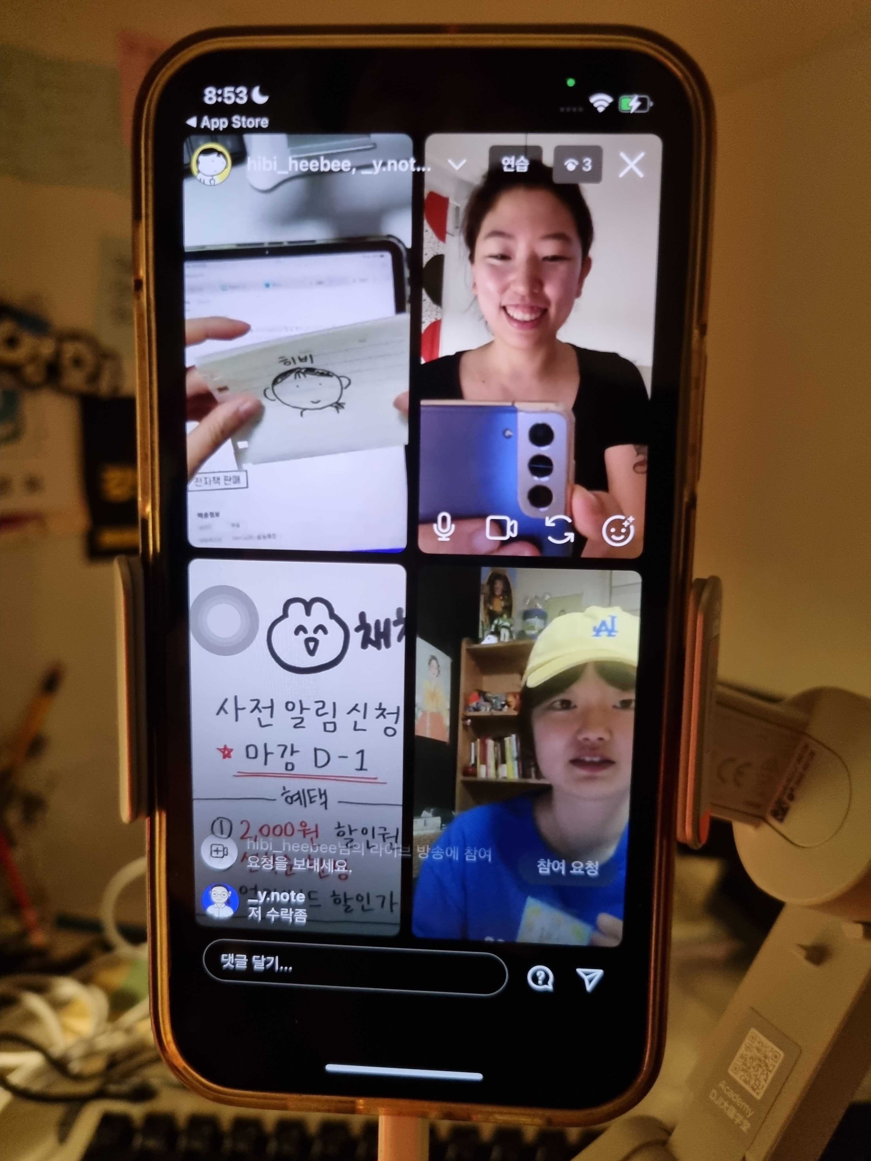 p.s. 이번 주에 친한 인서타툰 작가분들이랑 처음으로 라이브 방송 해 봤고동. (아래는 고 사진이야.) 나중에 독일가면 라방 틈틈이 켜 봐야겠당. 누가 보려나~? 앗, 맞아 나 머리도 짤랐다 호호홓⭐