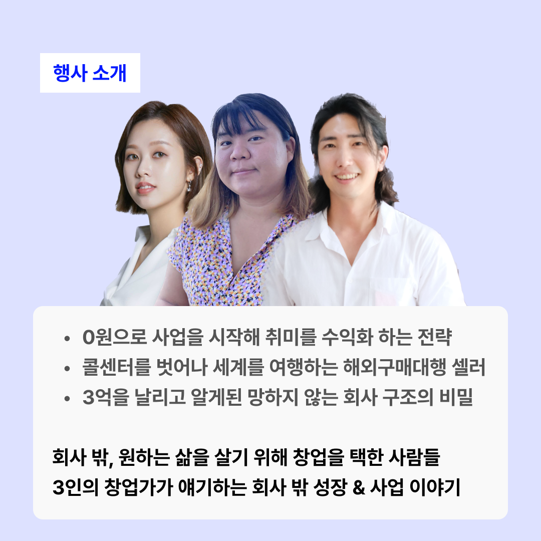 P.S. 내가 매니저로 활동하고 있는 하이아웃풋 클럽에서, 돌아오는 목요일 (10/26) 저녁에 온라인으로 컨퍼런스를 할 예정이야. 콜센터 직원에서 내가 원하는 삶을 살기위해 전재산을 털어넣어 디지털 노마드 생활을 시작한 모모님 이야기, 취미를 수익화해서 사업을 시작한 로사장님, 사업하며 3억 날렸지만 일어나 법인 10개 세운 킹홍님 이야기까지 다양한 삶의 형태로 살아가는 사람들의 이야기를 들을 수 있어! ㅎㅎㅎ (나도 들을 예정 >_<) 내 세상을 넓히고 싶은 공주들에게 추천할게!