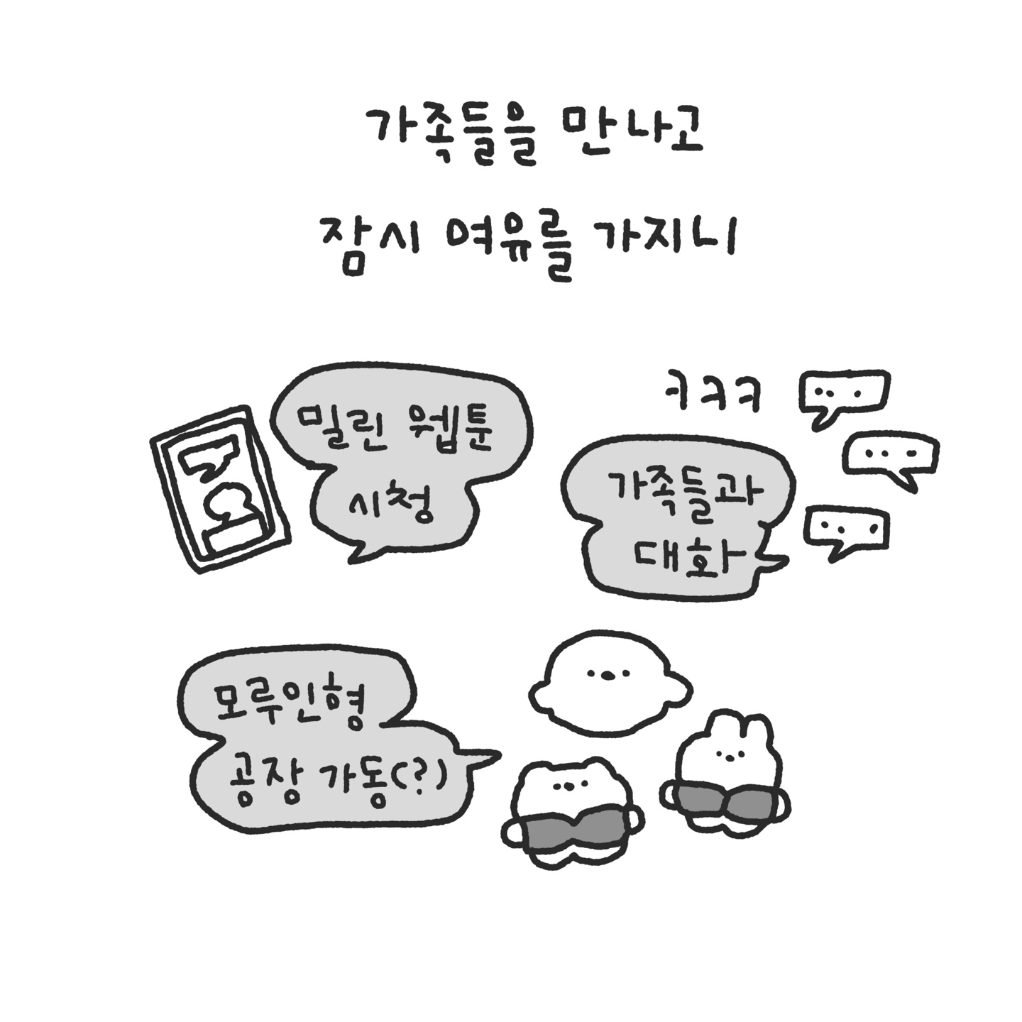 그래서 설 기간 동안 며칠은은 최소한의 일만 하고 무기력하게 누워 시간을 때웠고, 며칠은 가족들과 함께 맛있는 걸 먹으며 시간을 보냈어. 그러니까 조금씩 나아지는 것 같았어. 마음에 너무 여유가 없었나봐. 최근 스스로에게 너무 채찍질만 한 게 아닌가 싶더라고.