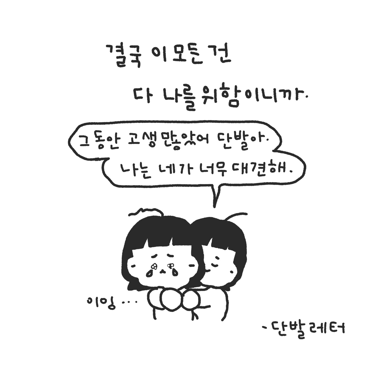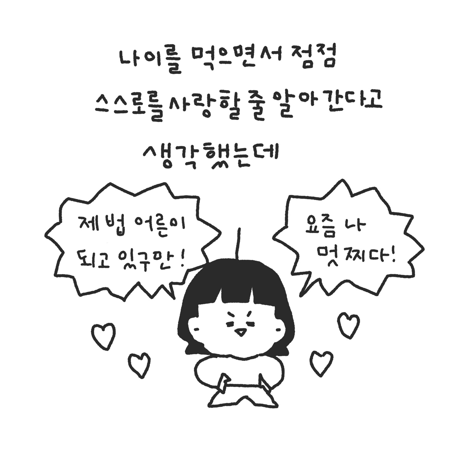 자존감은 평생 만들어가는 숙제같아. 한 없이 올라가다가도 어느 순간 쫄보 단발, 큰 일을 마주하면 또 쪼구라들지.. ^^* 어찌하겠어. 이 모든 것이 단단한 어른이 되어가는 과정인걸. 받아들여야지 ! ㅎ 공주는 자존감 회복, 어떻게 하고 있어? 공주도 스스로 칭찬하는 시간들을 잘 가지고 있어? 공주의 꿀팁도 궁금하다. ㅎㅎ