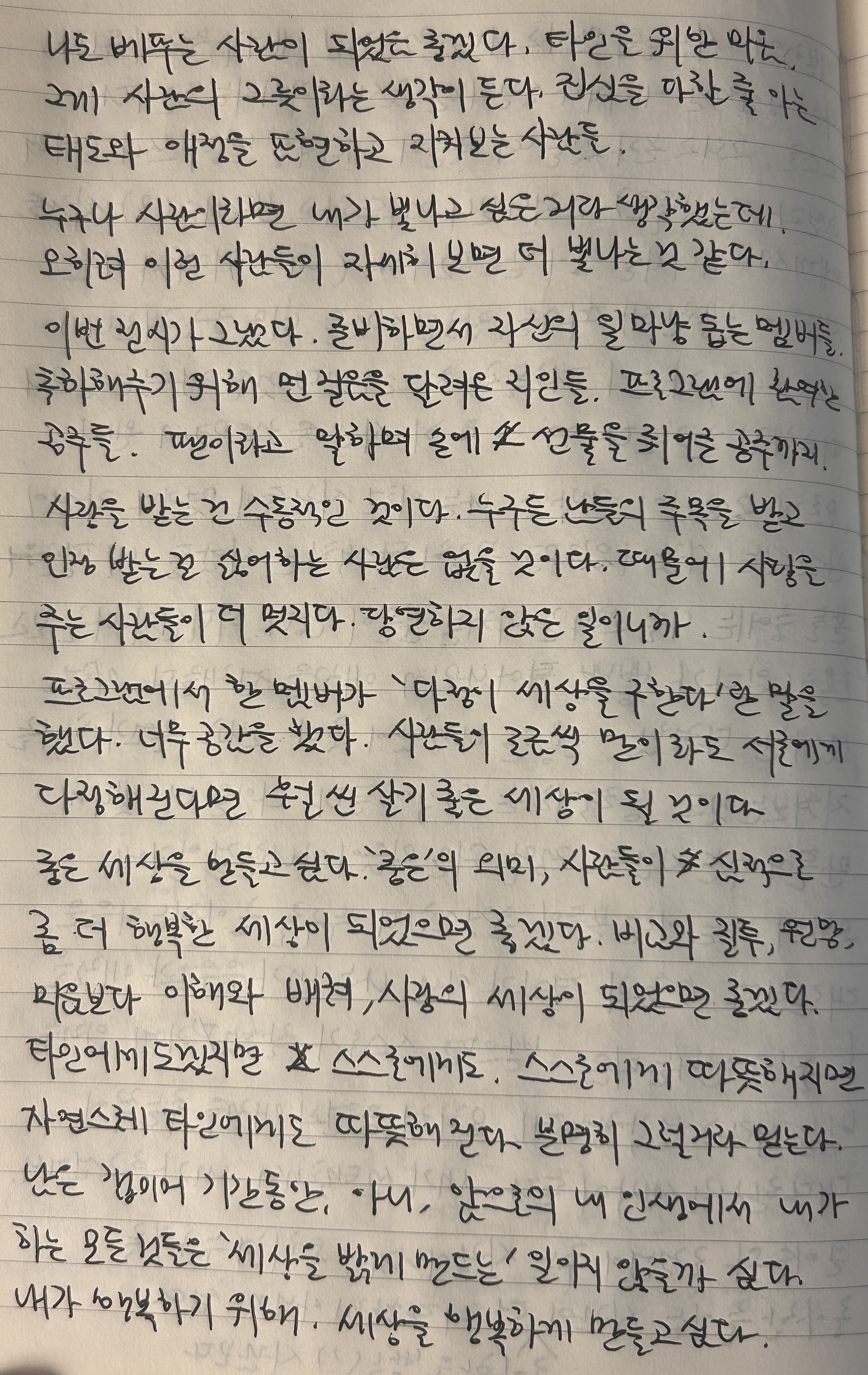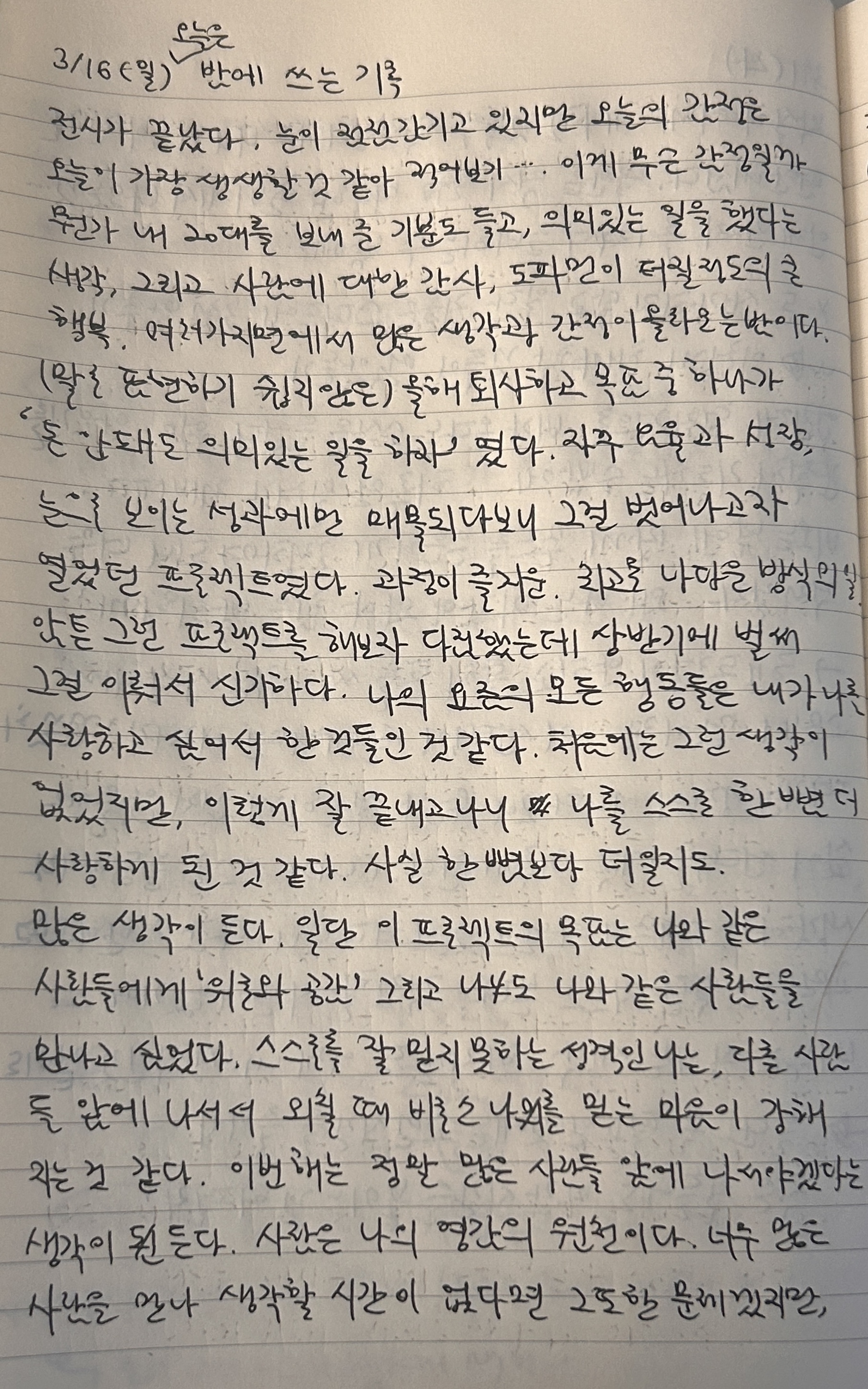 다시 한 번 더 나의 백수 전시 과정을 지켜봐주고, 함께 해줘서 고마워. 공주가 없었으면 절대 시작도 못했을 거라고 생각해. 방문해 준 공주들도, 멀리서 응원해 준 공주들도 땡스어랏❤️ 일기에도 적었지만, 레터를 쓰는 나보다 이 레터를 꾸준히 봐주고 있는 공주가 더 대단한 거라고 생각해. 누구를 응원하는 멋진 마음을 가진 공주를 본받아 나도 많이 응원하고 다닐게!!! (?) ㅎㅎㅎㅎ