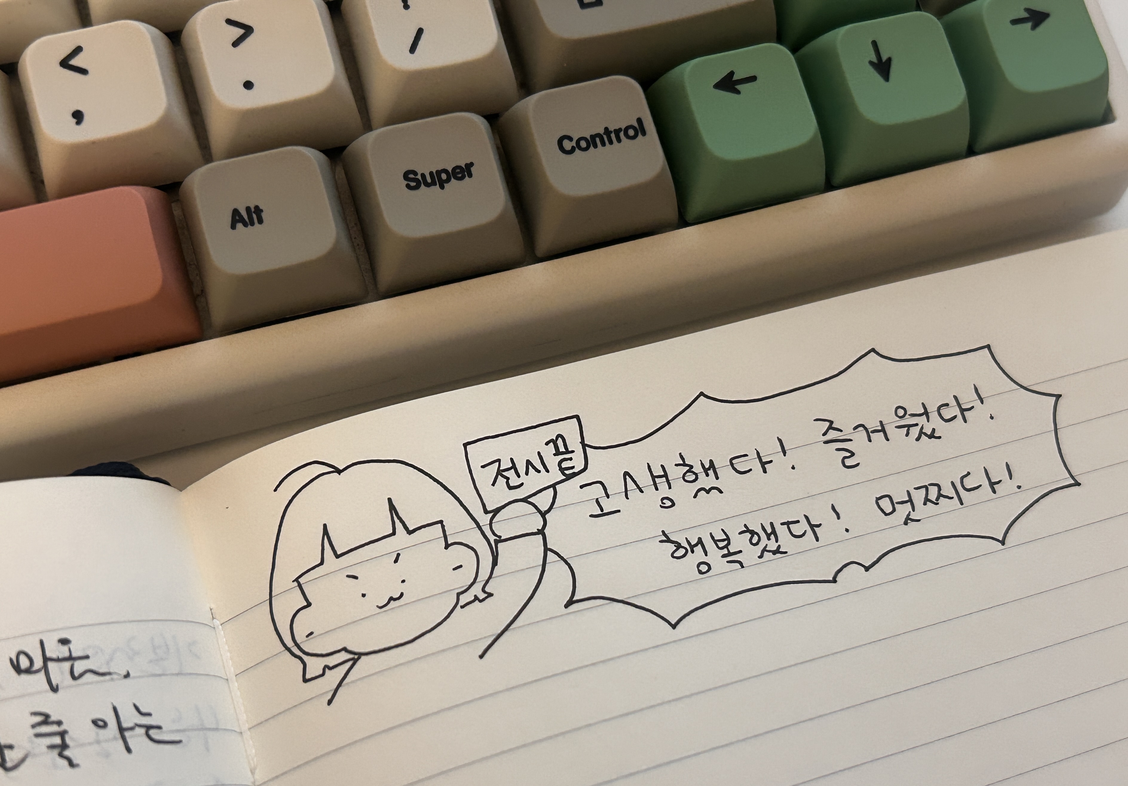 어찌보면 이번 전시는 회고 끝판왕 + 자기 확신 끝판왕의 시간이지 않을까 싶어. 놀면서도 불안해서, 스스로에 대한 확신이 약해져서, 뒤쳐지면 어떡하지 걱정이 들어서 매번 마음이 늪으로 빠지곤 했는데 이번 전시를 하면서 100명이 넘는 사람들 만나 '나 쉬려고 그만뒀고, 지금 잘 쉬고 있어요.' 외치고 다니니 지금 내가 나다운 길을 걷고 있다는 믿음이 점점 자리잡더라구. 내가 더 많은 것을 받아가는 전시였어. 이제 노는 것에 좀 떳떳해졌다 ^__^ 열심히 안 살거야 ! (당당)
